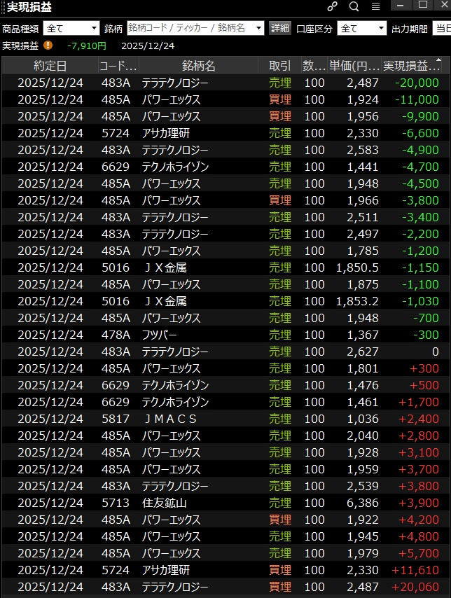 本日の収支 ▲7,910円(パワー含益2,800円S高持越し)